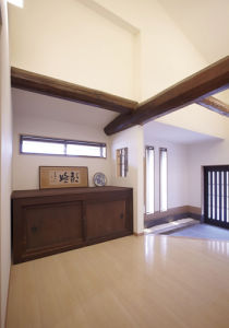 2部屋の和室をつなげたLDKは、多くのご友人をお招きできる大空間に。畳コーナーは一段高くして、いすに座った人と目線が同じになるような設計としました。リビングの上にはロフトを設け、収納スペースも確保されています。LDK同様玄関も吹き抜けにし、住まい全体が開放的になりました。