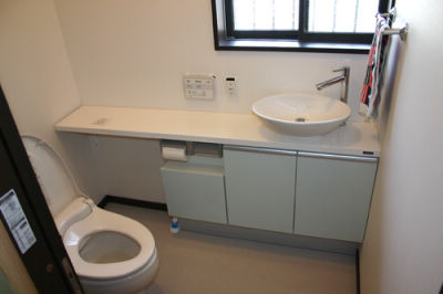 広々としたトイレ。手洗いカウンターにはペーパーや
