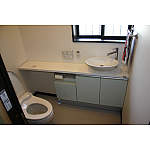 広々としたトイレ。手洗いカウンターにはペーパーや洗剤のストック、お掃除道具もしっかり収納できます。