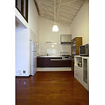ガレージの天井をあらわしにした広い空間が印象的なダイニングキッチン。扉柄は、チェリーの床に合わせてダークセピアを選択しました