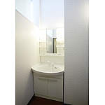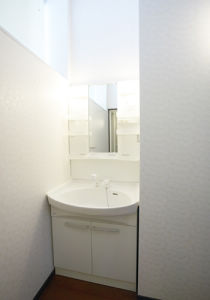 右側のキッチン側の冷蔵庫スペースとの入れ違いで配置した洗面ドレッシング