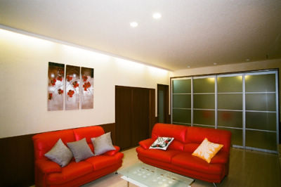 リビングの土佐漆喰の壁はライティングプランによる「あかり」で陰影を映し出し、癒しの空間を演出。