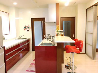 シンクを2つ設けお母様と奥様と二人で作業できるキッチンに。 リビングステーションLクラスで色はレッド。奥様こだわりのカラーです。