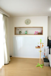 散らかりがちなお子様の玩具などを入れ、来客の際はロールスクリーンで目隠しできます。