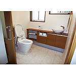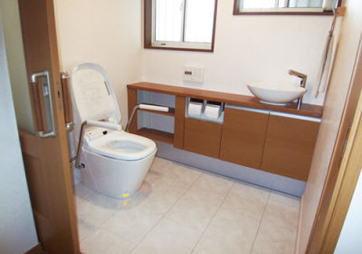 また小便器と大便器を分けて作られていたトイレも一つにまとめ、扉を全開口できる3枚連動引戸にして、車椅子を介助する方にもやさしい空間に。