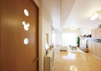 洗面室のドアにはミッキーマウスのシルエットが。遊び心もたっぷり
