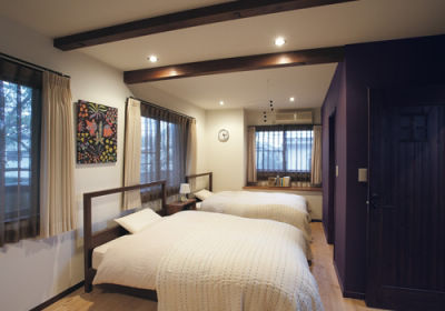 ウォークインクローゼットを設けた寝室は、濃いパープルの壁にすることでシックな印象に