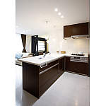 キッチンは「リビングステーション Sクラス」を採用。天然木に近い繊細でナチュラルな表情の扉柄が落ち着いた雰囲気を演出。L字型のレイアウトで効率的な家事動線を実現しました