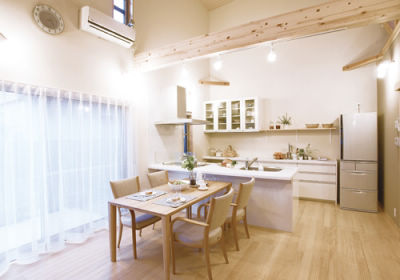 地盤沈下のため、リフォームから建て替えへの変更を決断されたH様。ご夫婦でゆったり過ごすシニアライフの場に求められたのは、無駄なスペースを減らしたコンパクト設計。「明るく風通し良く、家事の負担を減らせるように」というご要望の下、計画が始まりました。新たに基礎をつくり直し、耐震性をまず建物の足元からしっかり補強。隣家と近接し日中光が入りにくかった1階は、南面に配置したLDK全体を吹き抜け構造に。2階は必要最小限の間取りにすることで、開放感あふれる大空間を実現しました。天井にはトップライトを2カ所設置。ここち良い光の溜まり場と風の通り道をつくり出したLDKと2階のフリースペースは、ご夫婦が休日を過ごす、それぞれのお気に入りの場になりました。玄関は北入りから東入りに変更し、LDK・寝室と直結。長い廊下をなくし生活動線・家事動線を短くすることで、日々の暮らしやすさを実現しました。ご高齢になられても対応できるよう通路を広く、建具はすべて引戸に。また寝室周りにはトイレ・浴室を使い勝手よく集約。壁を抜けば1室にできるよう配置も工夫しています。