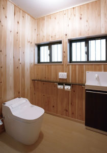 トイレも無垢材であたたかな雰囲気に。おそうじラクラクのアラウーノSを採用しています