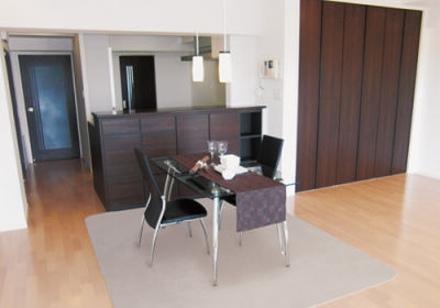 ご両親のお住まいの近くを条件に中古マンションを購入されたT様。古くても自分たちの思い通りの空間をつくりたいとリフォームされました。お料理しながら子供の姿が見えるようにと、対面式のキッチンに変更。さらに、隣接する和室を撤去し、広びろとしたリビングダイニングを実現しました。また、和室の押し入れを活かした大型収納や、キッチンのカウンター下にも収納を設置。収納力の高さが魅力です。キッチンとリビングに一体感が出るよう、ダークカラーで揃えることで、統一感のあるモダンな空間になりました。