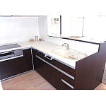 ご両親のお住まいの近くを条件に中古マンションを購入されたT様。古くても自分たちの思い通りの空間をつくりたいとリフォームされました。お料理しながら子供の姿が見えるようにと、対面式のキッチンに変更。さらに、隣接する和室を撤去し、広びろとしたリビングダイニングを実現しました。また、和室の押し入れを活かした大型収納や、キッチンのカウンター下にも収納を設置。収納力の高さが魅力です。キッチンとリビングに一体感が出るよう、ダークカラーで揃えることで、統一感のあるモダンな空間になりました。