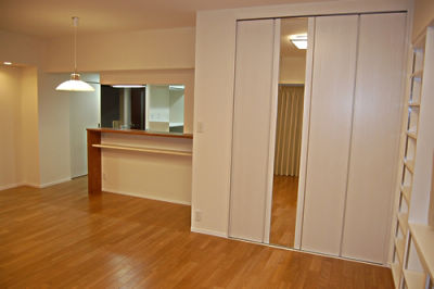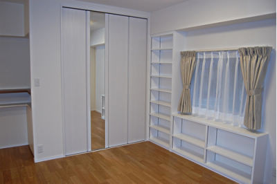 好きなものを飾った広いリビングに友人を呼ぶことが希望だったM様ご夫婦。お手持ちの家具は統一感がなく、書物が収まりきらないのがお悩みでしたので、壁固定の大容量本棚を初め、すっきり見せる収納をご提案するとともに、空き部屋にカビ・結露対策を施し、お子様の里帰り用居室にしました。
