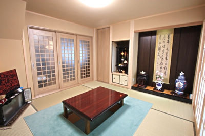 既存の掘りごたつはそのままに、和室とダイニングとの間仕切り戸はすりガラスとし光を取り入た。床の間の奥を収納部分にして面積を有効活用し、物入れの扉には取っ手レスを採用。外に面する掃出し窓には内障子とし雪見障子を採用。景色も覗けるデザインとした。