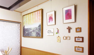 お子さまの絵画などを展示するギャラリースペースは、調理中でも目に入る位置に。