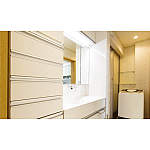 壁面いっぱいの洗面台は間口が広く、上質感が漂います。