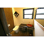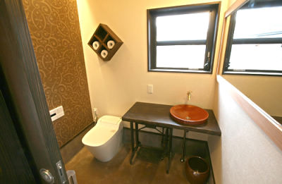おばーちゃんの足踏みミシンを洗面台にリメーク。トイレもコーニス照明で光の演出を。