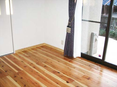 寝室にする部屋は自然素材にこだわりました。杉のムク材の床板は小さなお孫さんも「気持ちいい!」と言ってゴロゴロ寝転ぶそうです。