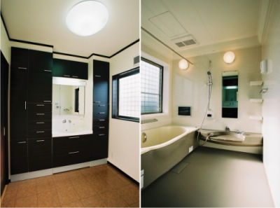 左≫使い勝手のよい収納充実の洗面ドレッシングを採用。右≫お孫さんと入っても余裕のスペース。