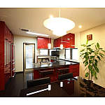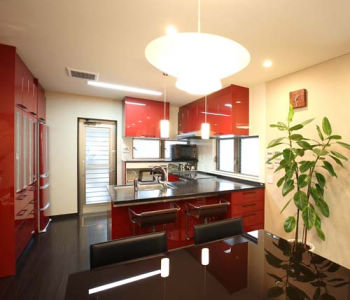 モノトーンのシックなお部屋にモダンな赤いキッチンが