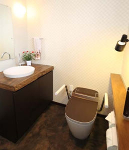 たっぷりスペースを確保したトイレ。書籍好きなご夫婦がここでもゆっくり読書ができるようにとスポットライトや棚を設け、まるで小さな図書館になりました。