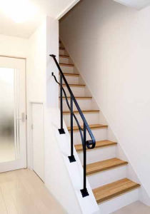階段のおしゃれなスチール製手摺はオーダーメイド。テーマカラーの白を際立たせるアクセントとしても効果的です