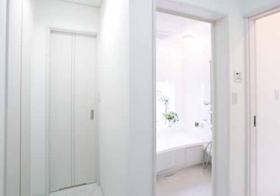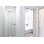 浴室は窓を通常よりも低めに取り付けたことで、湯船に浸かりながら坪庭の緑を楽しむことができる癒しの空間になりました。洗面室のドアは「リビエ」〈グレインホワイト柄〉を使用し、ホワイトで統一