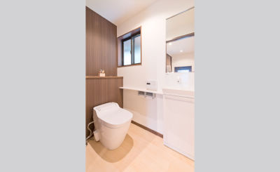 また、キッチンの扉柄やドア等の建具はウォールナット材で統一。深みのあるブラウンは、「一目惚れでした」とK様がおっしゃるとおり、空間全体の雰囲気をシックにまとめ上げ、美しい木目が温もりを感じさせてくれます。リビングも同じ素材でモダンな縦格子スクリーンをしつらえ、動線をすっきりと整理しました。「家の悩みが一度に解決できました」と、K様ご夫妻は大変満足のご様子です。