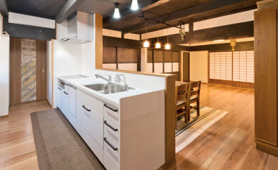 リビングをメインに、伝統の鴨居の黒や漆喰壁の白、現代の床材のブラウンが「和モダン」を演出し、伝統建築の美しさも現代に伝える空間に生まれ変わりました。また古民家としての趣きだけでなく、住まいとしての機能性もしっかり確保。キッチンは対面式を採用し、明るく広々としたリビング・ダイニングが見渡せます。昔ながらの民家の風合いを残しながら、世代を超えて住み継がれる心地よさにK様も「思い出を大切にした快適な空間ができました」とご満足な様子でした。