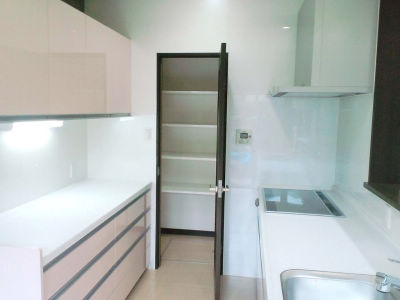 キッチンはリビングステーションLクラス。対面式にし、家族とのコミュニケーションを確保。ご希望だった大容量の収納庫を造作。