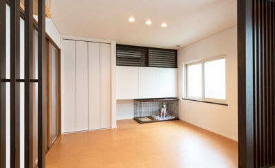 空間全体は既存のリビングに合わせたモダンな洋室にコーディネート。床はワンちゃんの足元に優しく負担が少ないよう、防滑性・耐傷性のあるコルク材を採用しました。また、既存の押し入れは建具を変え、そのままワンちゃん周りのグッズがたっぷり収納できるクローゼットに。床の間だった場所にも収納を設け、ケア用品やドッグフードのストック等も収納が可能になりました。今ではすっかりワンちゃんの憩いの場となっているようです。