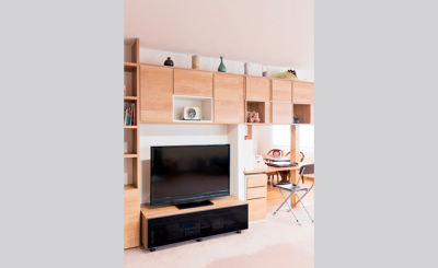 リビングとキッチンを分断していた間仕切り壁を撤去し、システム収納「キュビオス」でゆるやかにつながる空間に。以前はこまごました雑貨等をあちこちの小さな引き出しやリビングボードにしまわれていましたが、メインでお使いになる収納スペースが一箇所にまとまり、探す手間がなくなりました。お部屋全体も片付いて、スッキリとした印象になりました。