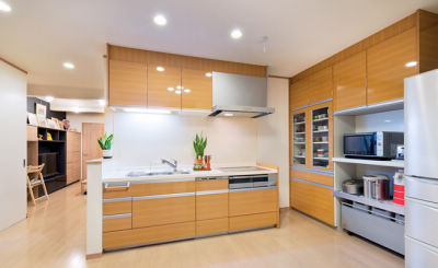 いちばんの特長となるのは、商店街に面して設計された趣味のお部屋。琉球畳をあしらった和モダンな空間には、折り紙が趣味だという奥様が、ご自身の作品を飾れる飾り棚を設けました。お部屋の外にも、作品をディスプレイできるショーウインドウを設置。色とりどりの折り紙に彩られた華やかな表情の住まいが生まれました。また、壁面収納や掘りごたつを採用したリビング、収納力抜群のシステムキッチンなど、暮らしの中心となる空間の使い心地も一新。趣味を活かす空間と、住まいの機能性が両立した住まいにK様も「毎日が楽しい」とご満悦のご様子です。
