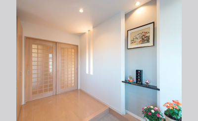 中でも、居心地の良さに大きく貢献しているのが全面に取り入れたLED照明。玄関ホールやリビング、キッチンなどに取り入れられた間接照明・建築化照明によって、やわらかい灯りが家全体を包み込みます。照明全体はライティングコントロールによって調色・調光も思いのままに。シーンによってさまざまな灯りが使い分けられるため、家族の団らんを気持ちよく演出。「節電にもなって一石二鳥です」と、生まれ変わったわが家を満喫していらっしゃるようです。