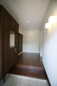 玄関の段差が大きく上がりにくかったのですべての床の高さを下げました。収納力のある玄関収納も設置。階段も蹴り上げが高く手摺もなかったので階段の長さを少し延ばして高さを緩やかにし、手摺も設置。