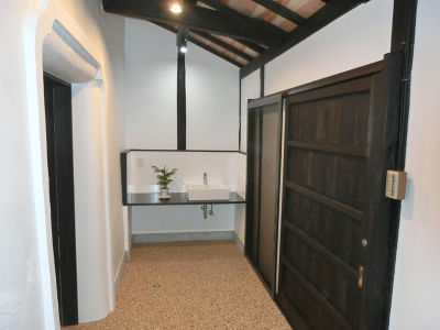 土間とドアを新しくし、壁は漆喰、床は洗い出しで仕上げる。