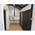 入口の引き戸も塗り直し、色調を揃えた。部屋に水廻りは配置していないが、入口には手洗いカウンターを設置。
