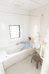 「前はタイルの床で本当に冷たかった」とおっしゃるご主人。今は予備暖房で暖かくして入浴できるようになりました。以前は灯油・ガス・電気を使用されていましたが、エコキュートも導入してオール電化に。光熱費は以前に比べて約5000円も安くなったとか。