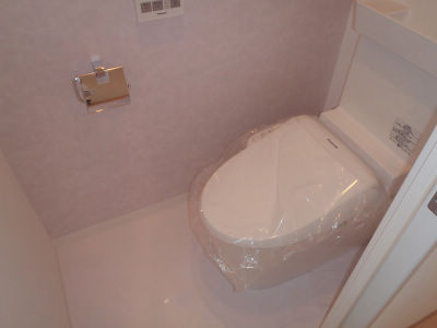とにかくお掃除性重視の奥様がこだわったおトイレ空間!壁のクロスもお掃除がしやすいかを実際にショールームで触ってチェック!また、トイレに入って正面の壁はピンクのかわいいアクセントパネルとなっている。