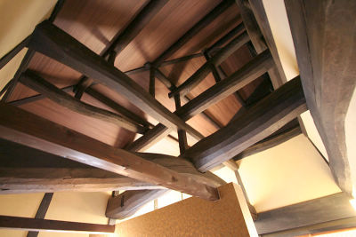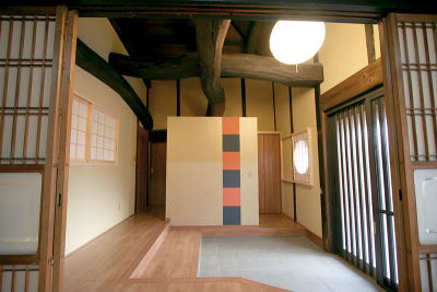 玄関を開けると思わずうなってしまう。幾重にも見える丸太の梁・天秤・母屋。見上げるとその迫力に誰もが圧倒される。丸太もさることながら、それに負けない存在感のある壁。日本の彩、緋(アケ)と留紺(トマリコン)を交互に配色。玄関収納の目隠しとしての役割も兼ねてます。