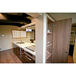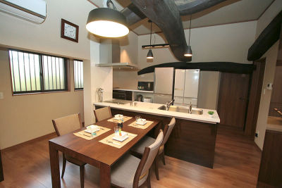 ここにも堂々たる梁が。落ち着いた雰囲気を大切にしたダイニングキッチン。またIHヒーター、食洗機、フォンテ等最新設備を採用。どうしても抜けない柱を利用してキッチン側面の壁裏にちょっとした収納をつくってみました。物であふれていたキッチン廻りはサイドのカップボードですっきり収納。