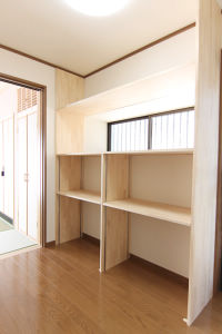 設置した棚は収納する物のサイズと、出窓に無理せず手が届く高さ奥行きに設定し造作。