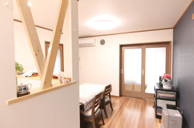 外せなかった柱と筋交いは、カウンターの高さだけを壁にし、上部は空けて筋交いを見せる仕上げに。圧迫感を軽減し、光もさえぎりません。