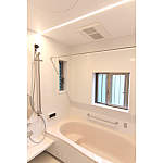 間取りの変更により、1216(0.75坪)から1616(1坪)にサイズUP。白を基調とし、窓も2ヶ所設け、明るい浴室になりました。
