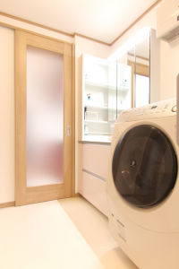 洗面化粧台・洗濯機を設置した洗面脱衣室ができました。サイドキャビネットや造作棚で収納スペースもしっかり確保。パネル仕様の扉で明るさにも配慮。