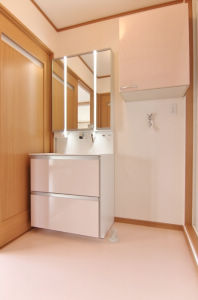 洗面所はかわいらしくピンクで統一し、お気に入りだった以前のミニキッチンの吊戸棚を再利用。