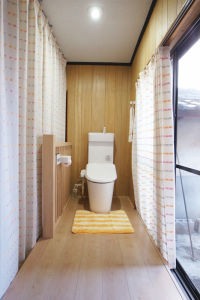 4畳の和室のうち1畳分を床上げして段差無しに。落下防止のための柵を施し、手洗い器付アラウーノVを設置。明るく開放的なトイレになりました。電気スイッチを付ける場所が窓上の垂れ壁しかなかったため、センサー付ダウンライトを採用。