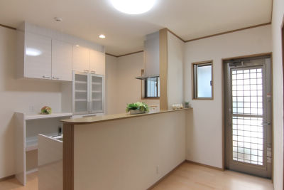 築30年平屋のK様邸。暗くごちゃごちゃしたDKを明るく快適にしたい、とご相談をいただきました。奥様ご希望の対面キッチンは、手元が隠せるように30cmほど立上りを付けました。吊戸を無くしても十分な収納を兼ね備えたキッチンは、溢れていた調理器具もしっかり収納できます。白を基調としたナチュラルでやさしい雰囲気のDKはご夫婦共に理想通りの空間になった!とご満足していただけました。