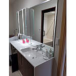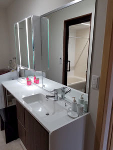 洗面化粧台は当初取替る予定ではありませんでした。鏡を多く設置することで、空間に広がりがみられ、開放的な洗面所となりました。
