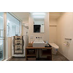 トイレは洗面室と一緒にした省スペース設計。バスルームはガラス壁にして、マンションにありがちな暗く狭い雰囲気を解消しました。
